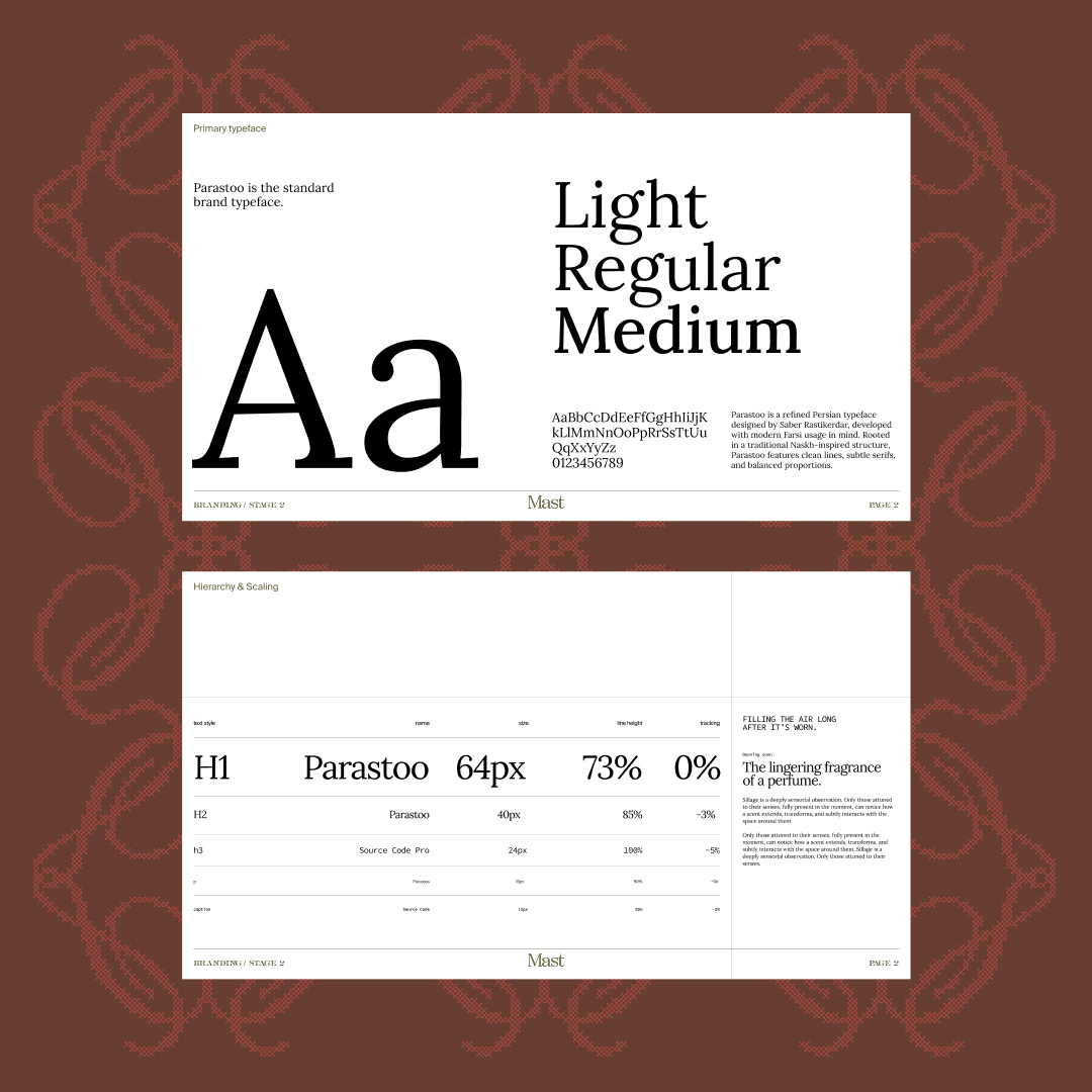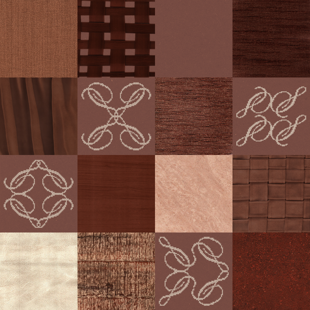 To connect the brand to its physical setting, fabrics and surfaces from the space were scanned and used as background textures. These material traces carry the idea of sillage through the space, an atmosphere that lingers, felt more than seen.